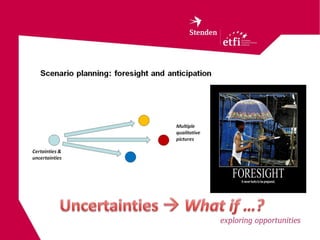 The document discusses several interconnected factors that influence the future of leisure and tourism, including political-institutional, economic, ecological, technological, and socio-cultural dimensions. It also examines internal dilemmas around funding and external uncertainties around demographics, politics, economics, and technology that could impact opportunities and courses of action for organizations in this industry.