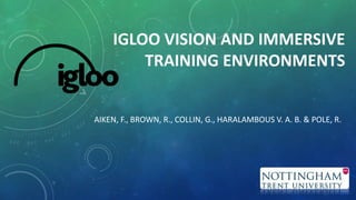 The document discusses the benefits of group training (Igloo) versus individual training (Oculus Rift) in immersive environments. Key benefits of Igloo include increased spatial awareness, social interaction, verbal and non-verbal communication, and possibility of playback and feedback. Igloo training may result in higher fidelity, stronger transactive memory formation between teammates, and improved team performance compared to isolated Oculus Rift training. The document outlines various factors that influence the transfer of training, including environment fidelity, feedback, and cross-training methods.