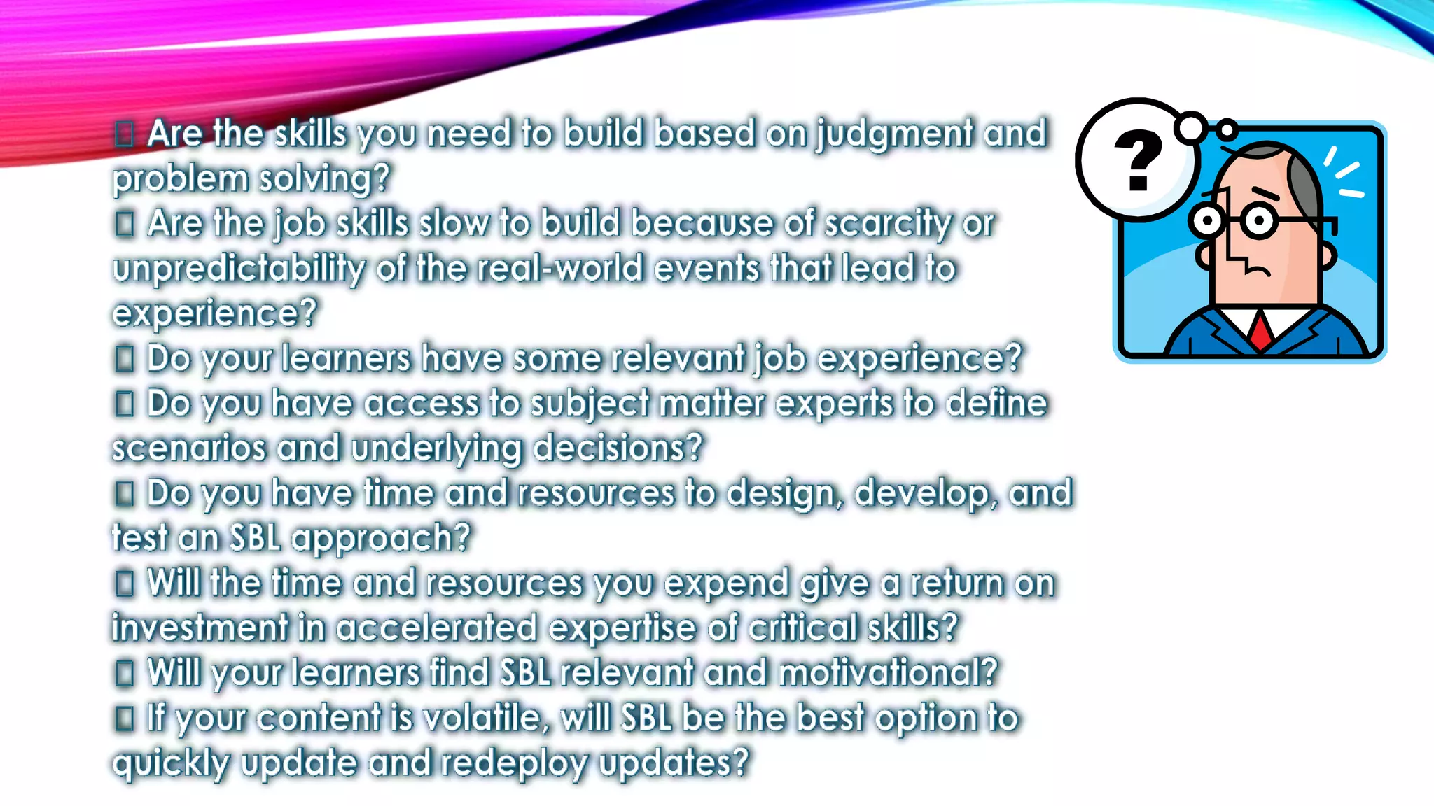 Scenario-based learning involves participants solving authentic job tasks or problems. It is also known as problem-based or case-based learning. Scenario-based learning works best for teaching nonroutine job tasks involving judgment and decision making, and is most suitable for learners with some relevant job experience. Scenario-based learning should be used to make learning effective and affective when addressing roles requiring decision-making, higher-order thinking skills, or behaviors and attitudes.