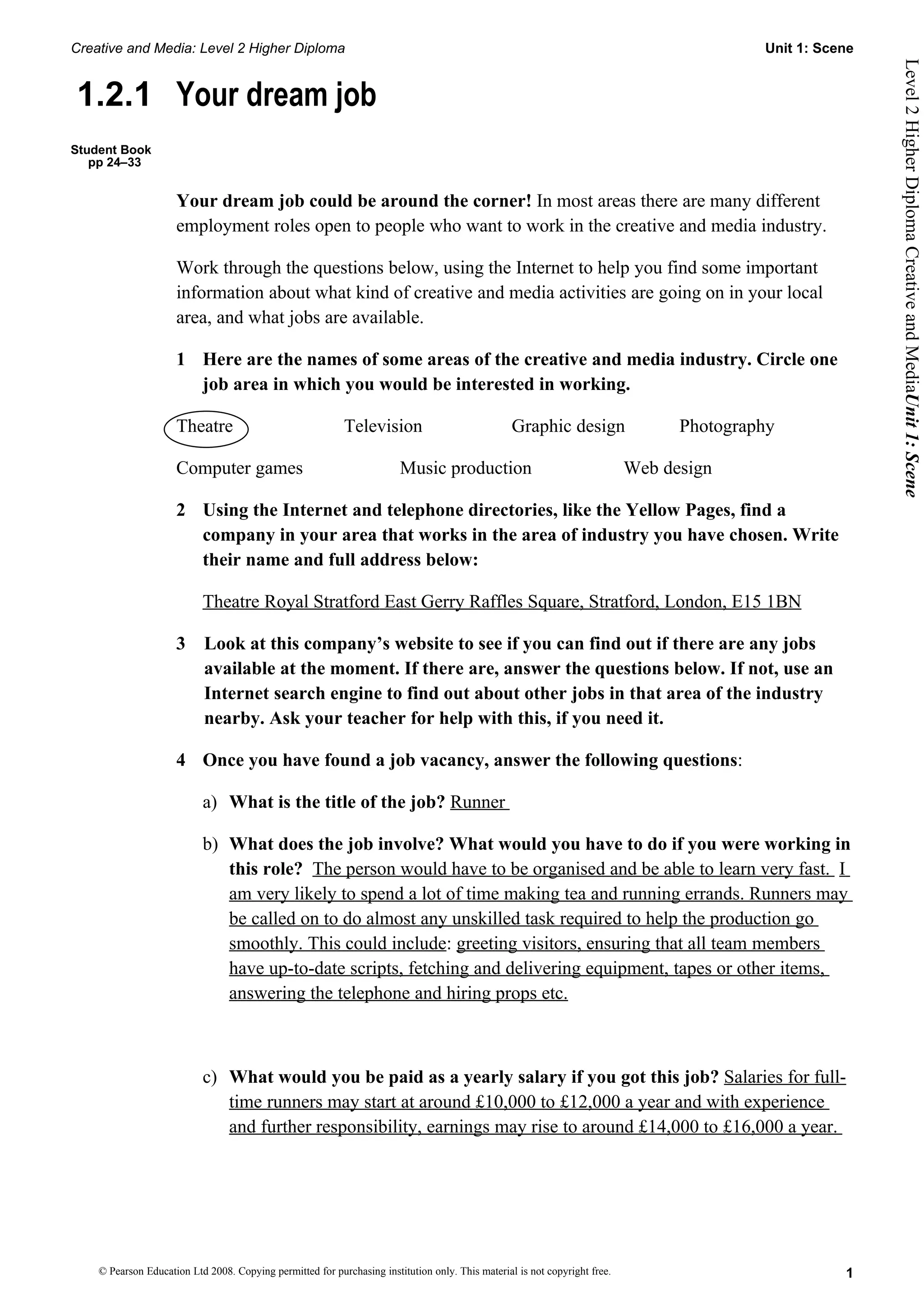 This document provides information about finding a dream job in the creative and media industries. It instructs students to research job opportunities in their local area by choosing an area of interest and finding a related company. One example job found is a runner at a local theater. The summary describes that this job involves tasks like greeting visitors, fetching equipment, and answering phones. The yearly salary for this entry-level position is £10,000 to £16,000. Qualifications include enthusiasm, communication skills, organization, and the ability to work well in a team. The document advises students to improve their skills in these areas to meet job requirements.