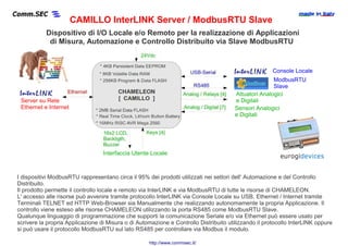 Il documento descrive un dispositivo di I/O locale e remoto, il Camillo Interlink Server, utilizzato per applicazioni di misura e automazione attraverso il protocollo Modbus RTU. Il dispositivo consente il controllo locale e remoto di risorse tramite interfacce USB, Ethernet e Internet. Inoltre, supporta vari linguaggi di programmazione per sviluppare applicazioni personalizzate di controllo distribuito.