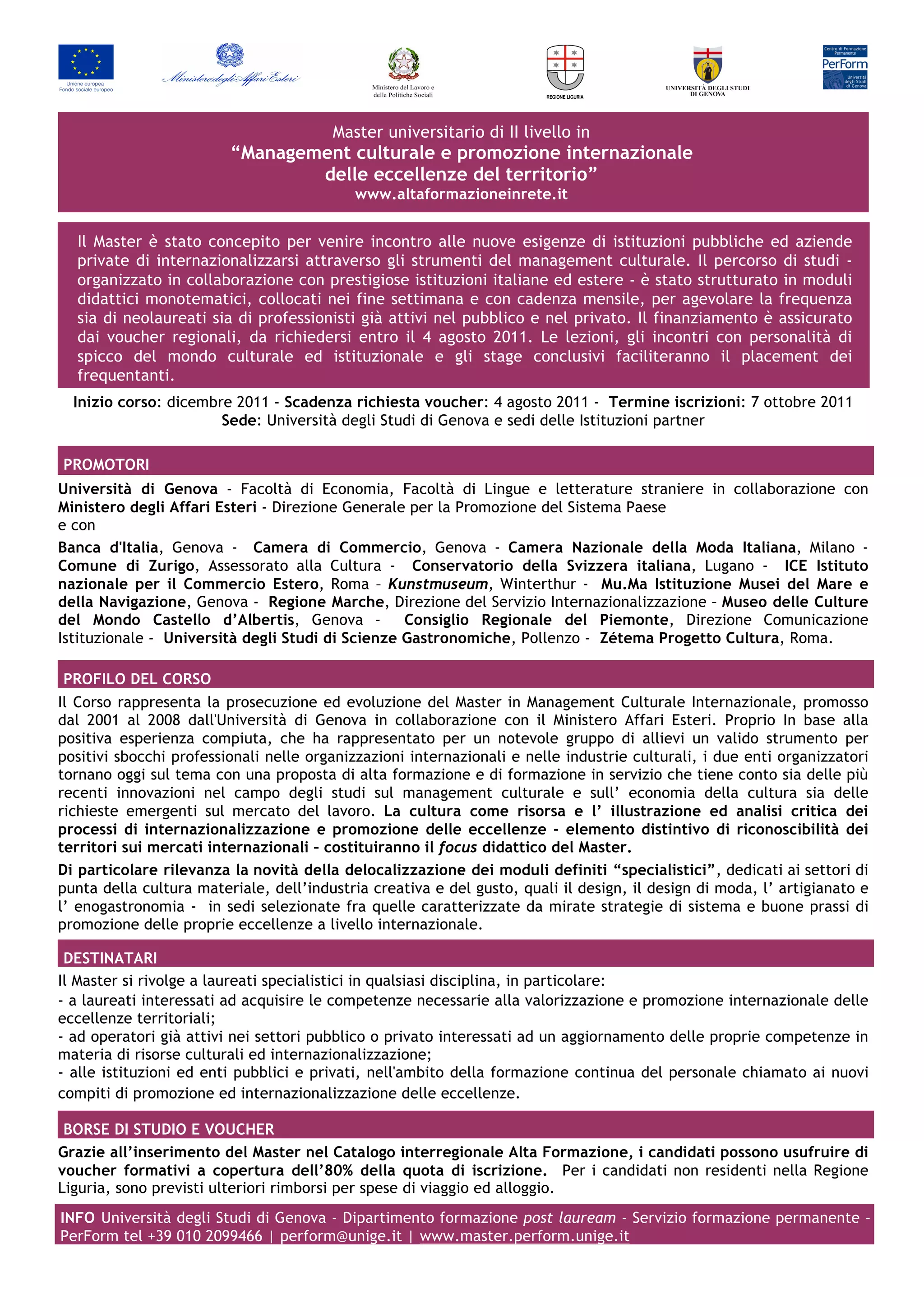Il master universitario di II livello in 'management culturale e promozione internazionale delle eccellenze del territorio' è progettato per supportare le istituzioni pubbliche e le aziende private nella loro internazionalizzazione tramite il management culturale. Il programma, che inizia a dicembre 2011, offre moduli didattici mensili, borse di studio e voucher per aiutare i partecipanti nel finanziamento della quota d'iscrizione, rivolgendosi a laureati e professionisti interessati ad aggiornare le loro competenze. Le lezioni e le esperienze pratiche faciliteranno il placement dei partecipanti attraverso collaborazioni con diverse istituzioni italiane ed estere.