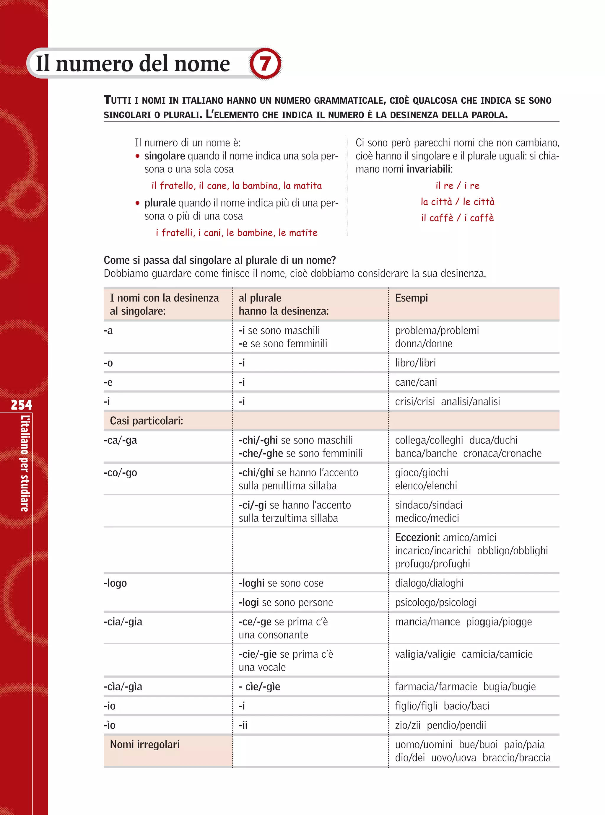Il documento tratta della grammatica italiana, in particolare del numero dei nomi, distinguendo tra singolare e plurale. Spiega come determinare la forma plurale dei nomi in base alle loro desinenze, fornendo esempi e casi particolari, inclusi i nomi invariabili e le eccezioni. Include anche esercizi pratici per coniugare nomi singolari e plurali.