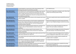 This document outlines the weekly progress and plans over a 5 month period for a group creating a music video as part of an A2 Media Studies course. It details research, choosing a song, storyboarding, test filming, editing, additional filming, and completing post-production work and evaluations. Contingency plans are made in case of problems with filming or editing deadlines. The overall plan is to have a completed music video and evaluations uploaded to YouTube and the student's blog by the end of the period.