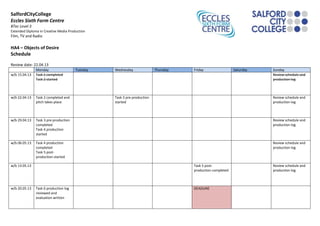 The document outlines a schedule for completing tasks in a BTEC Level 3 Extended Diploma in Creative Media Production course at Eccles Sixth Form Centre. It details the tasks to be completed each week between April 15th and May 20th, including pre-production, production, and post-production stages. A review of the production schedule and log takes place weekly with a final deadline on May 20th for all tasks and evaluations to be completed.