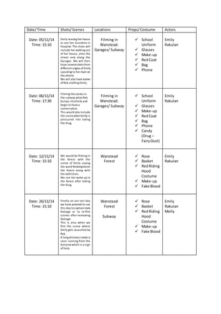 The document outlines the filming schedule and locations for a short film over four dates. On the first date, scenes of the main character Emily leaving her house and speaking on the phone will be filmed in Wanstead. The second date will film scenes of Emily in the subway where she is pressured to take drugs by the character Rak. The third date films scenes in Wanstead Forest of Emily waking up after taking drugs. The final date leaves time to re-film scenes and will film Emily's assault by Rak in the forest, with a runner in the distance signaling for help.