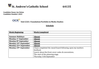 - The document is a schedule that outlines the work completed by Joe Dolan for their Foundation Portfolio in Media Studies course between September and January.