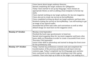 - It shows the planning, research, and design work done for preliminary tasks like a mood board, target audience analysis, and magazine contents page, as well as the main task of designing a magazine front cover and double page spread.