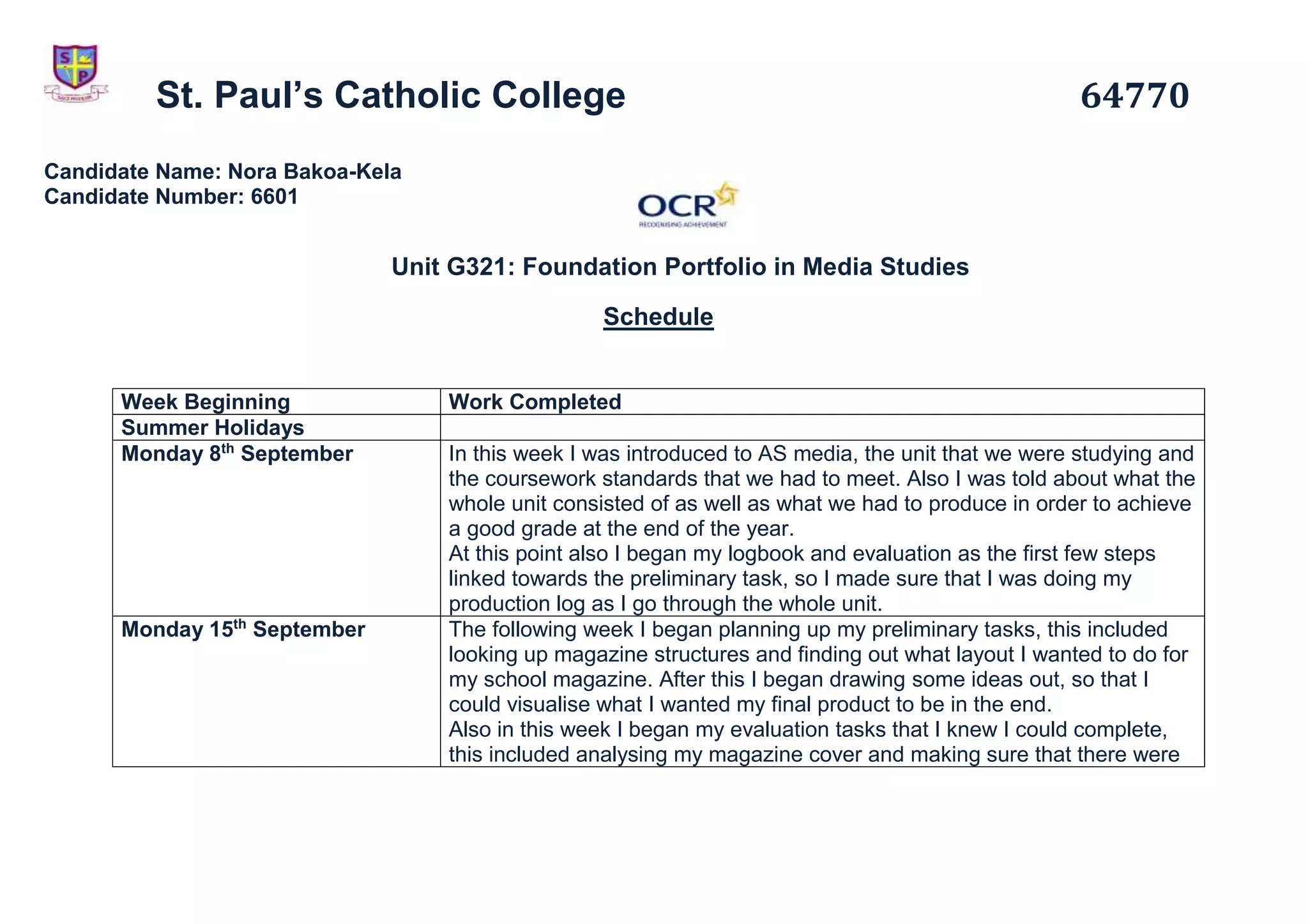 Nora Bakoa-Kela completed the preliminary and main tasks for her Foundation Portfolio in Media Studies unit. Over the course of several months, she planned, researched, and created a school magazine. This included drawing layout ideas, researching target audiences, photographing models, and designing pages in Adobe Photoshop. Specifically, Nora designed the magazine cover and contents page for her preliminary task and a double page spread for her main task. She documented her process and progress in a production logbook.