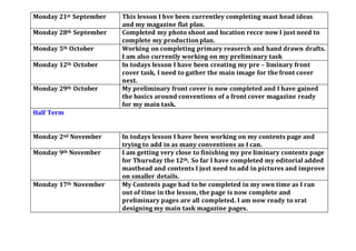 Jon Villacci completed a foundation portfolio in media studies at St. Andrew's Catholic School. Over the course of several months, Jon researched magazines, developed mood boards and mind maps, conducted photo shoots, and created preliminary front covers and contents pages. Jon's schedule shows progress designing magazine pages for a main task, including a front cover incorporating conventions like barcodes and a masthead, and a contents page with images and sublines.
