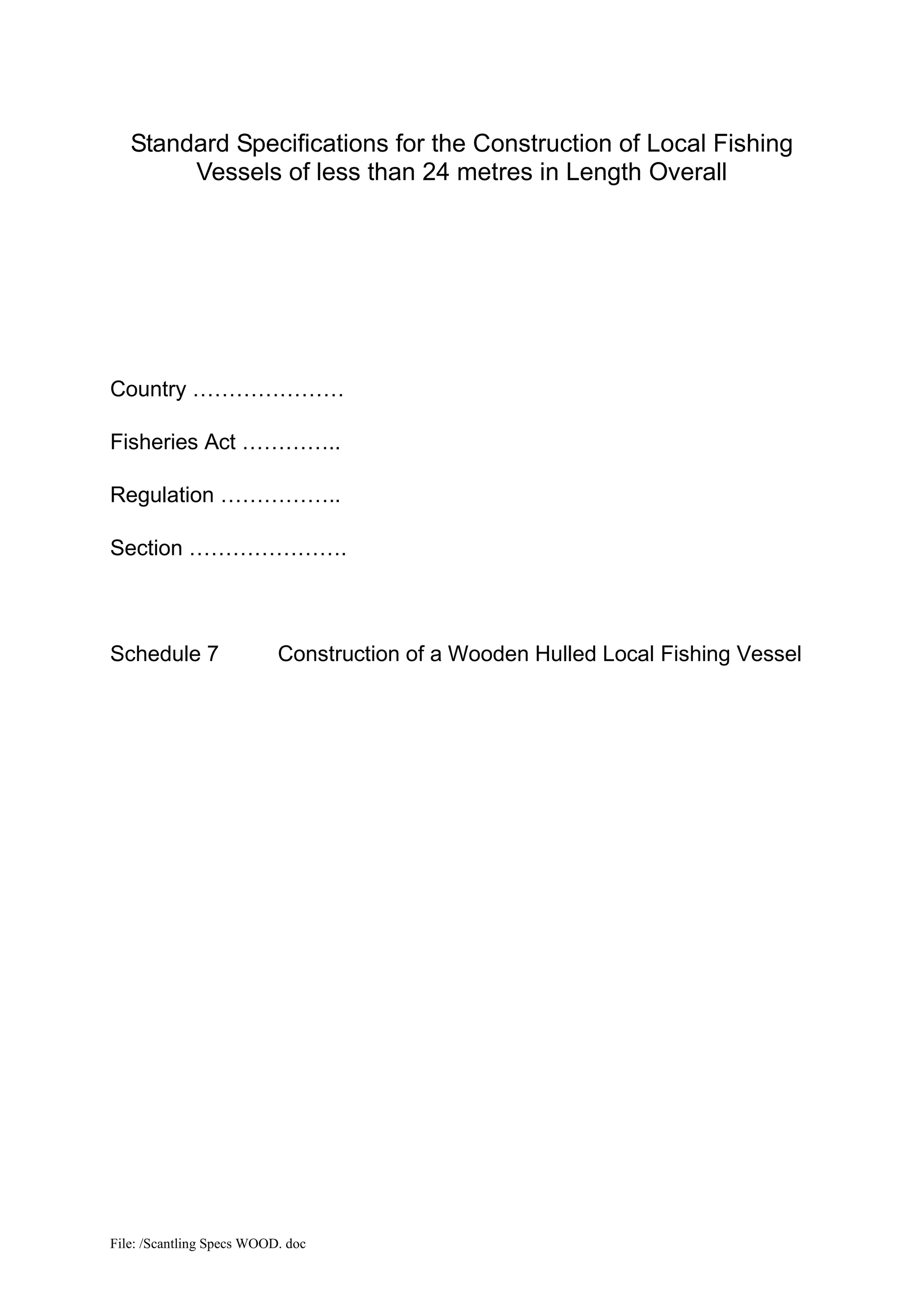 The document outlines specifications for constructing wooden hulled fishing vessels under 24 meters in length, including definitions, material requirements, and fastening practices. Key sections discuss the scantlings and assembly of various components such as the keel, frames, and decks, as well as recommendations for timber quality and moisture content. It serves as a guideline to ensure safety and structural integrity in local fishing vessel construction.