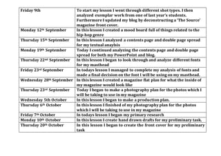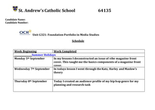 This document provides a weekly schedule and summary of work completed by a student for their Foundation Portfolio in Media Studies unit. Over the course of several months, the student worked on tasks analyzing magazines, creating mood boards, magazine layouts, photography plans, and draft magazine covers and spreads. They took photos, edited images, designed magazine pages in software like Photoshop and InDesign, and made corrections to their preliminary and main projects. By the end, the student had completed covers, contents pages, and double page spreads for both a preliminary and main magazine project.