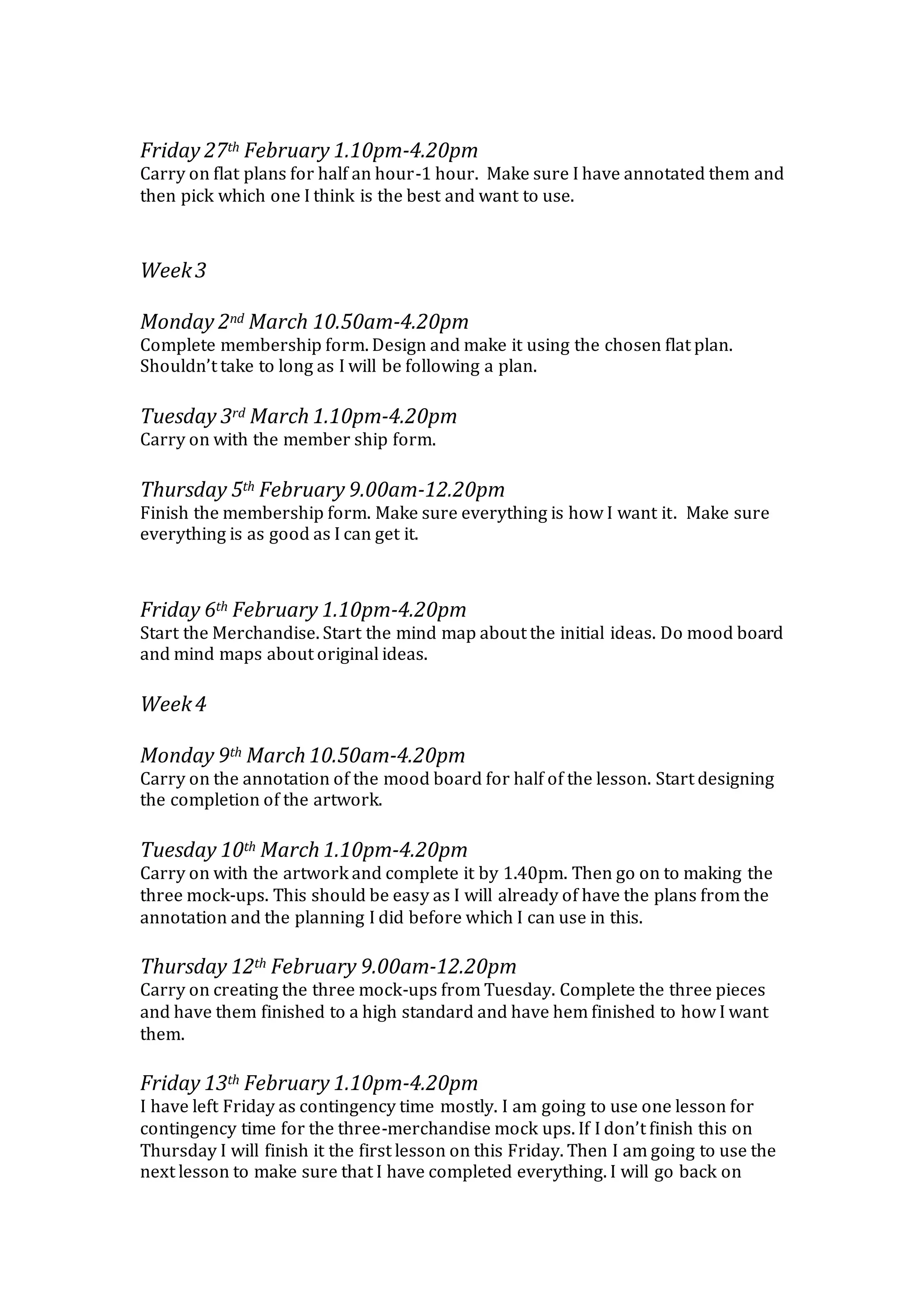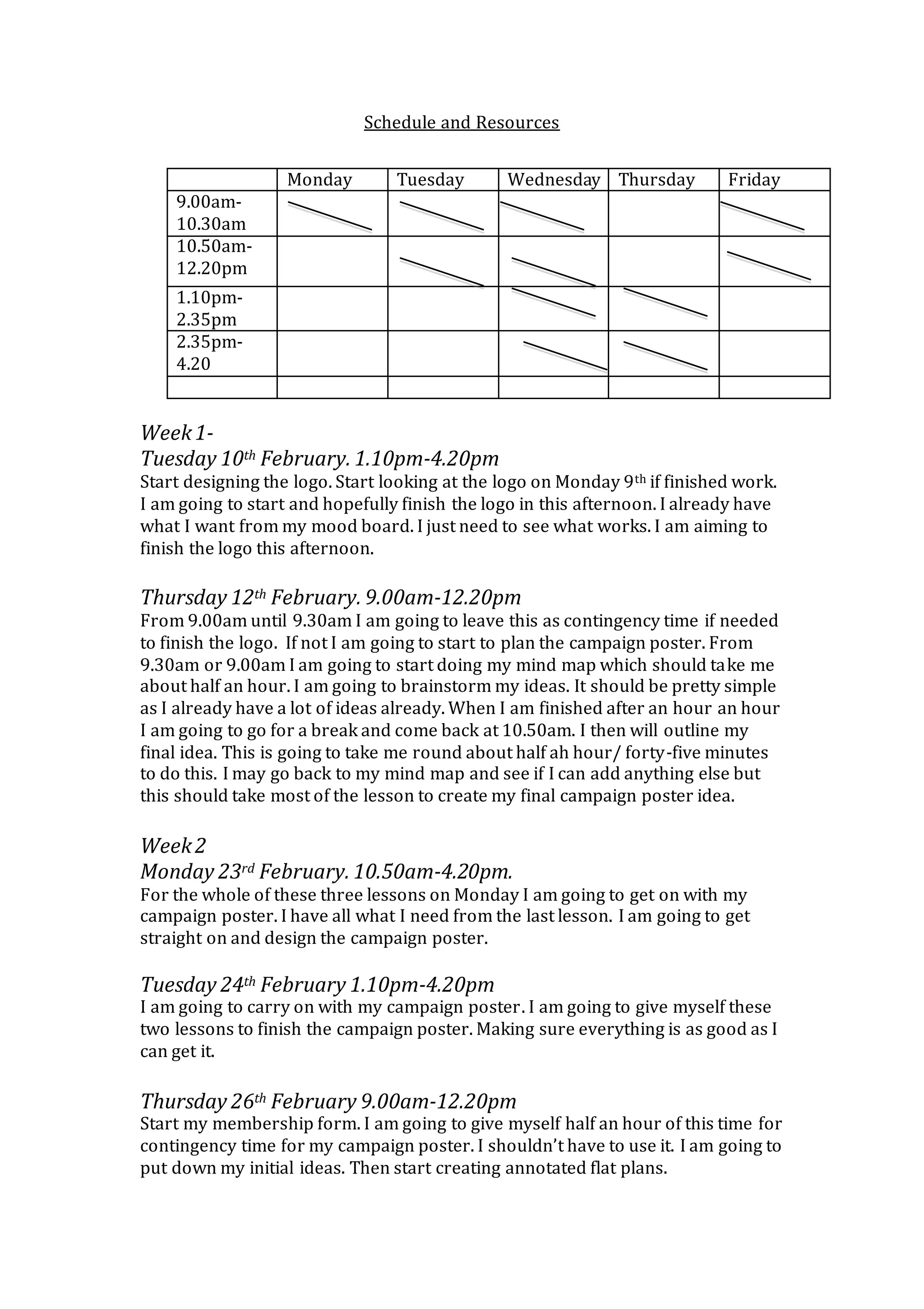 The document outlines a schedule and resources for a project over 4 weeks. In week 1, the creator plans to design a logo on Tuesday and plan a campaign poster on Thursday. Week 2 focuses on completing the campaign poster. Week 3 involves designing a membership form. Week 4 consists of creating merchandise mockups, including mind maps, artwork, and 3 mockups to be finished by Friday. Resources include stock images from Google, potential own photographs, Photoshop, and prior plans like mood boards and mind maps.