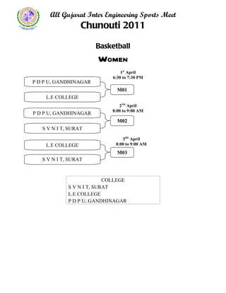 This document contains the schedule for the All Gujarat Inter Engineering Sports Meet basketball tournament in 2011. It lists the dates, times, and locations for the men's basketball matches between 7 colleges on April 1st, 3rd, and 2nd. It also lists the dates, times and locations for the women's basketball matches between 3 colleges on April 1st, 2nd, and 3rd.