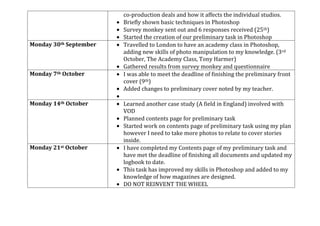 Liam De Costa completed a foundation portfolio in media studies over several months. He created a magazine concept and cover, contents page, double page spread, and blog documenting his process. Liam learned photography, design, and editing skills in Photoshop. He met deadlines, incorporated feedback, and reflected on his research and design decisions. The portfolio improved Liam's technical skills and knowledge of magazine design conventions.