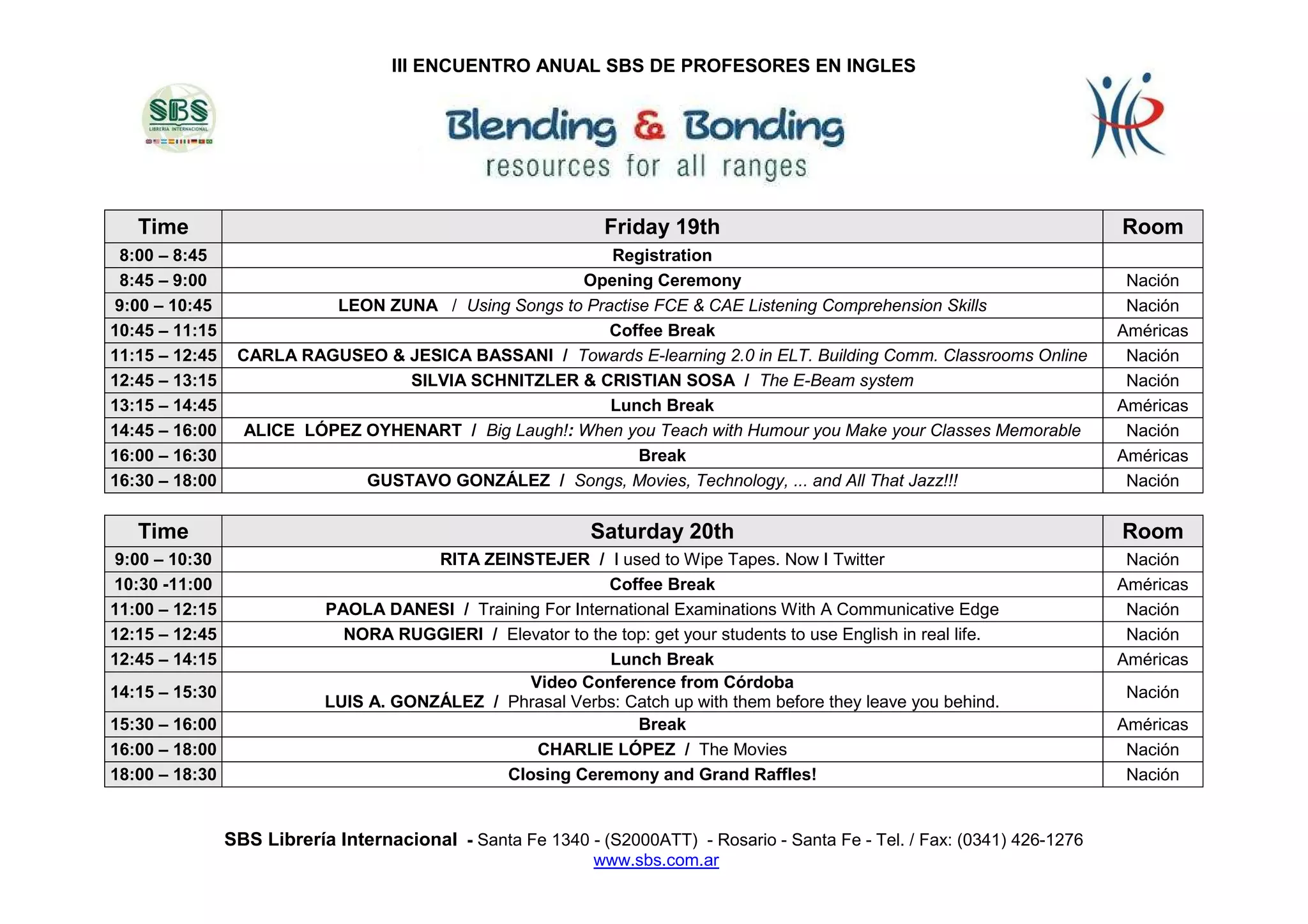 This document contains the schedule for the 3rd Annual English Teachers Conference hosted by SBS Librería Internacional. The conference will take place on Friday, March 19th and Saturday, March 20th. It includes various presentations and workshops on topics related to teaching English, such as using songs to practice listening skills, e-learning strategies, humor in teaching, movies in the classroom, and preparing for international exams. The events will be held in rooms Nación and Américas at the conference location from 8:00-18:00 each day, with breaks for coffee and lunch.