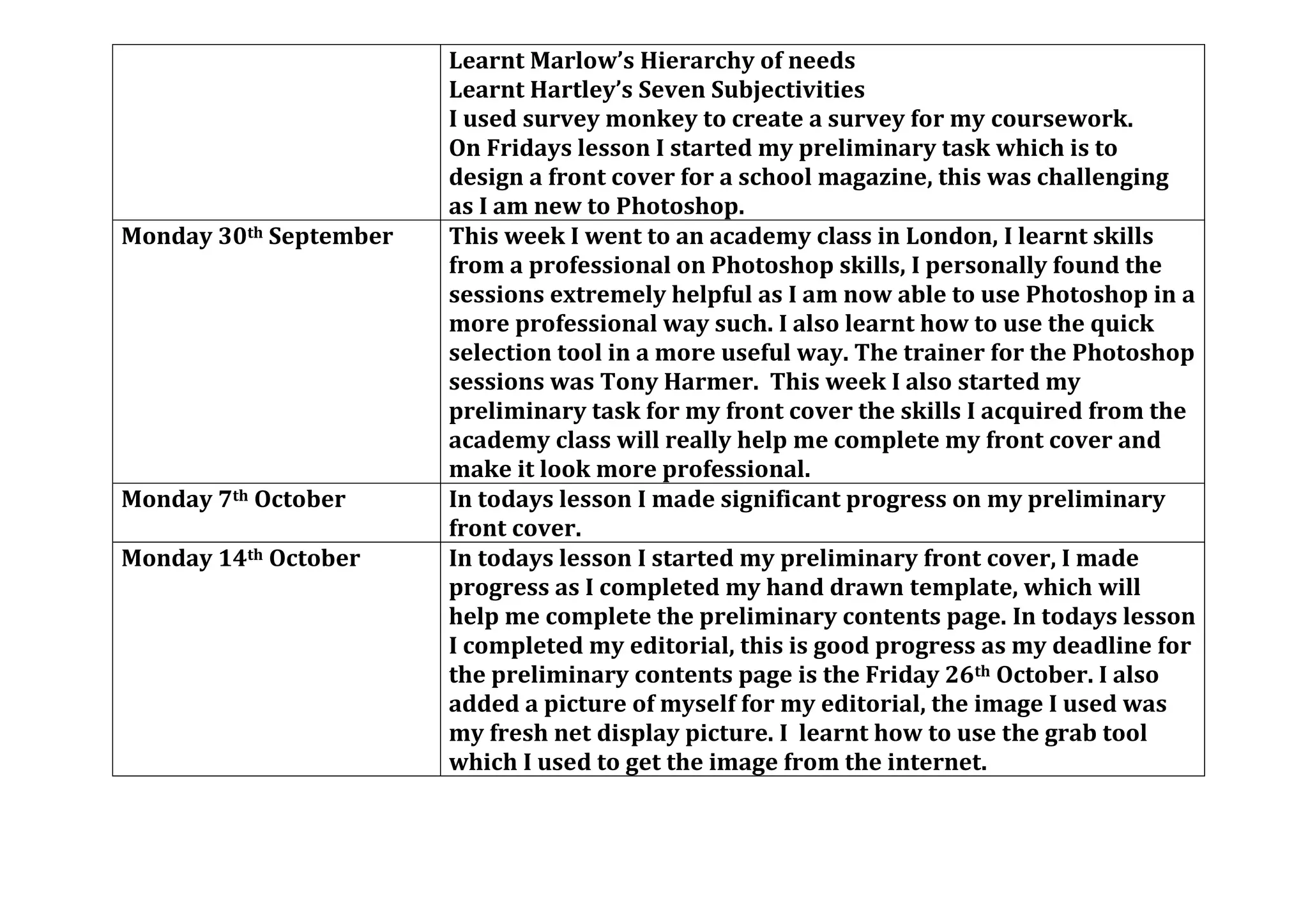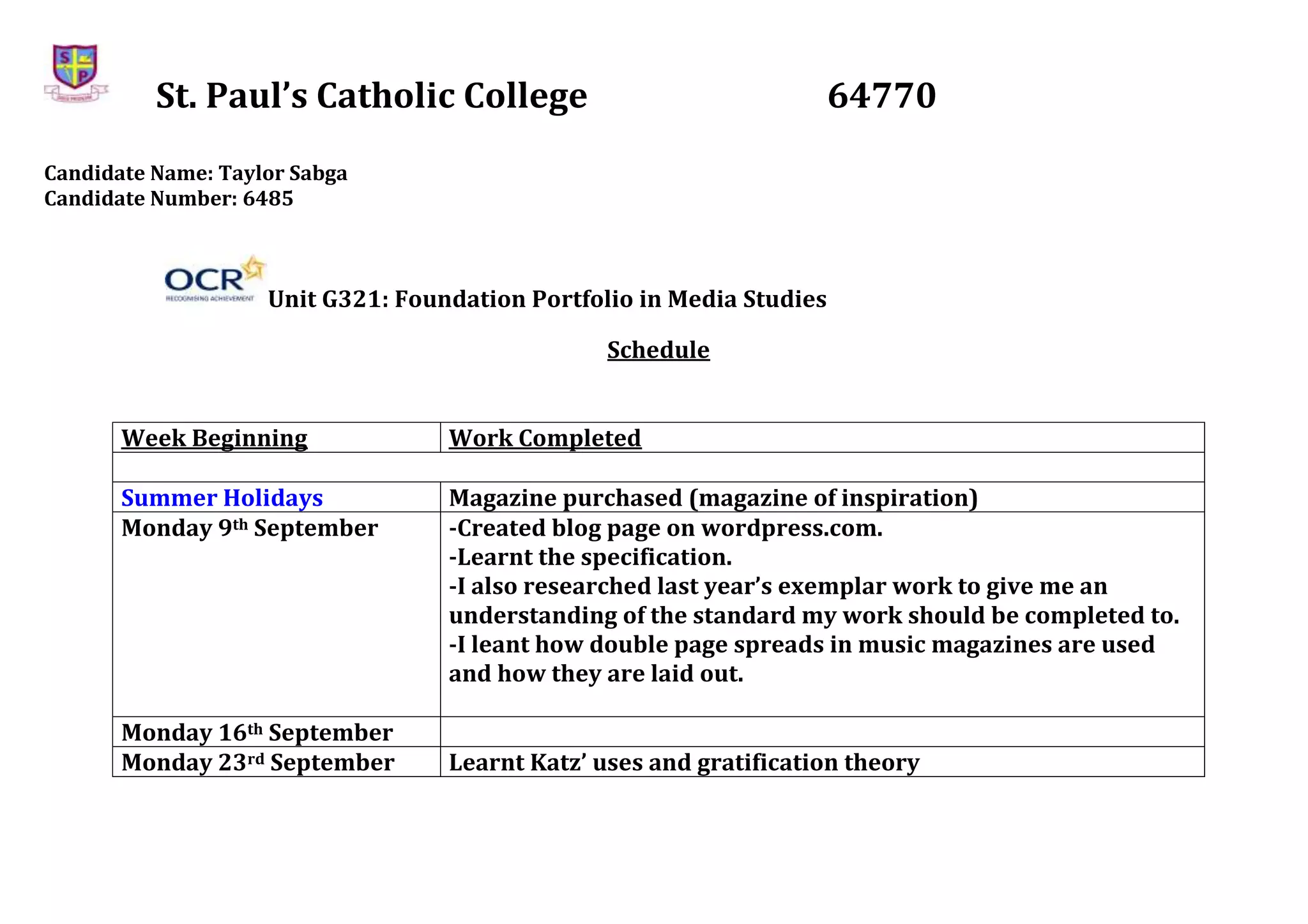 This document outlines the progress made by a student named Taylor Sabga on their media studies coursework over several months. It details the various tasks completed each week, including designing a magazine front cover in Photoshop, taking photos for spreads, learning relevant media theories, and making corrections. The coursework included preliminary and main tasks such as a front cover, contents page, and double-page interview spread for a mock music magazine.