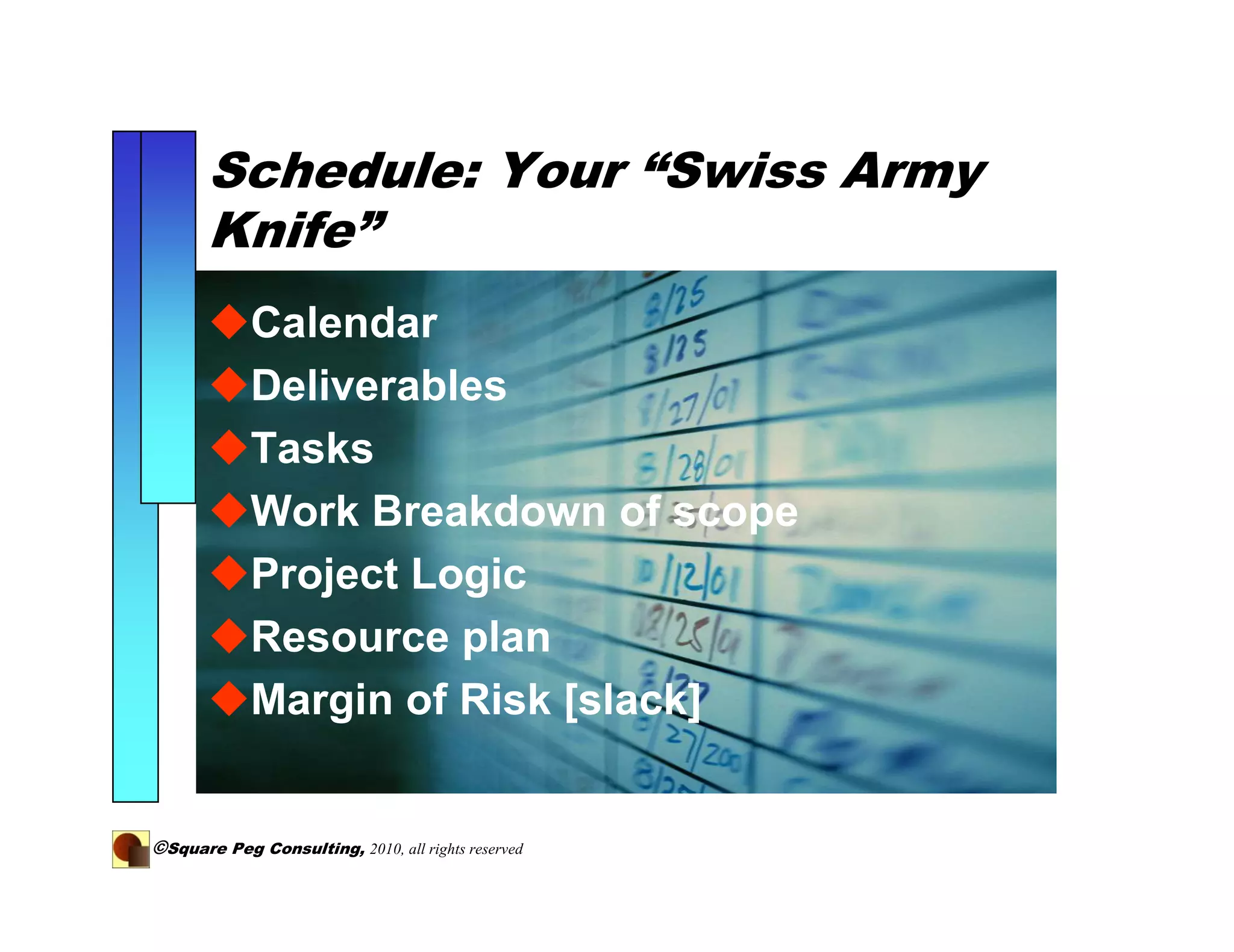 The document discusses adding quantitative risk analysis to project schedules. It recommends using statistical distributions and Monte Carlo simulation to model activity durations and understand project risks and outcomes. By breaking down long tasks and modeling their durations probabilistically, the variance of schedule estimates is reduced, providing a more accurate understanding of project risk.