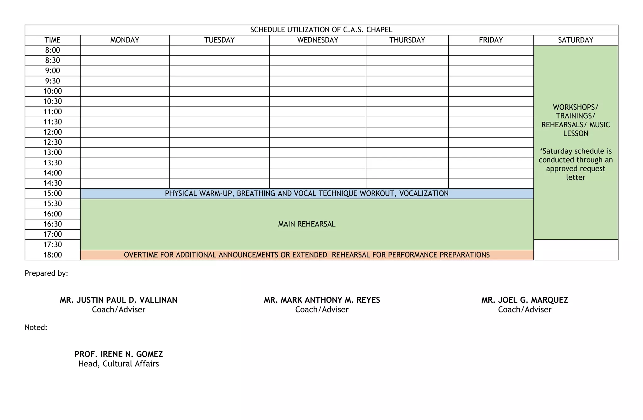 The document outlines the schedule for utilizing the C.A.S. Chapel at the university. It shows the daily time slots reserved for workshops, trainings, rehearsals, music lessons and the main rehearsal from 3-6pm. Saturday activities require an approved request letter as that schedule is flexible. The coaches/advisers and head of the cultural affairs department are also noted at the bottom.