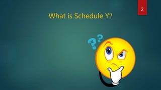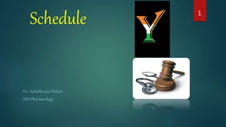 The document outlines the key aspects of Schedule Y, the law in India governing clinical trials. It discusses what Schedule Y is, its purpose, key amendments, and structure. It describes the application process for permission to conduct clinical trials and guidelines around phases of trials, special populations, informed consent, responsibilities of sponsors, investigators and ethics committees, and post-marketing surveillance. Appendices provide more details on required documents, reports, and data.