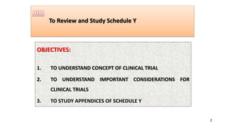 Ms. Sonali Diwate presented on reviewing and studying Schedule Y, which outlines the requirements and guidelines for permission to import, manufacture, or conduct clinical trials of new drugs in India. The objectives were to understand the concept of clinical trials, important considerations for clinical trials, and the appendices of Schedule Y. Schedule Y is divided into two main parts - important considerations for clinical trials in India, and the appendices, which provide guidelines for conducting clinical trials in compliance with regulatory standards.