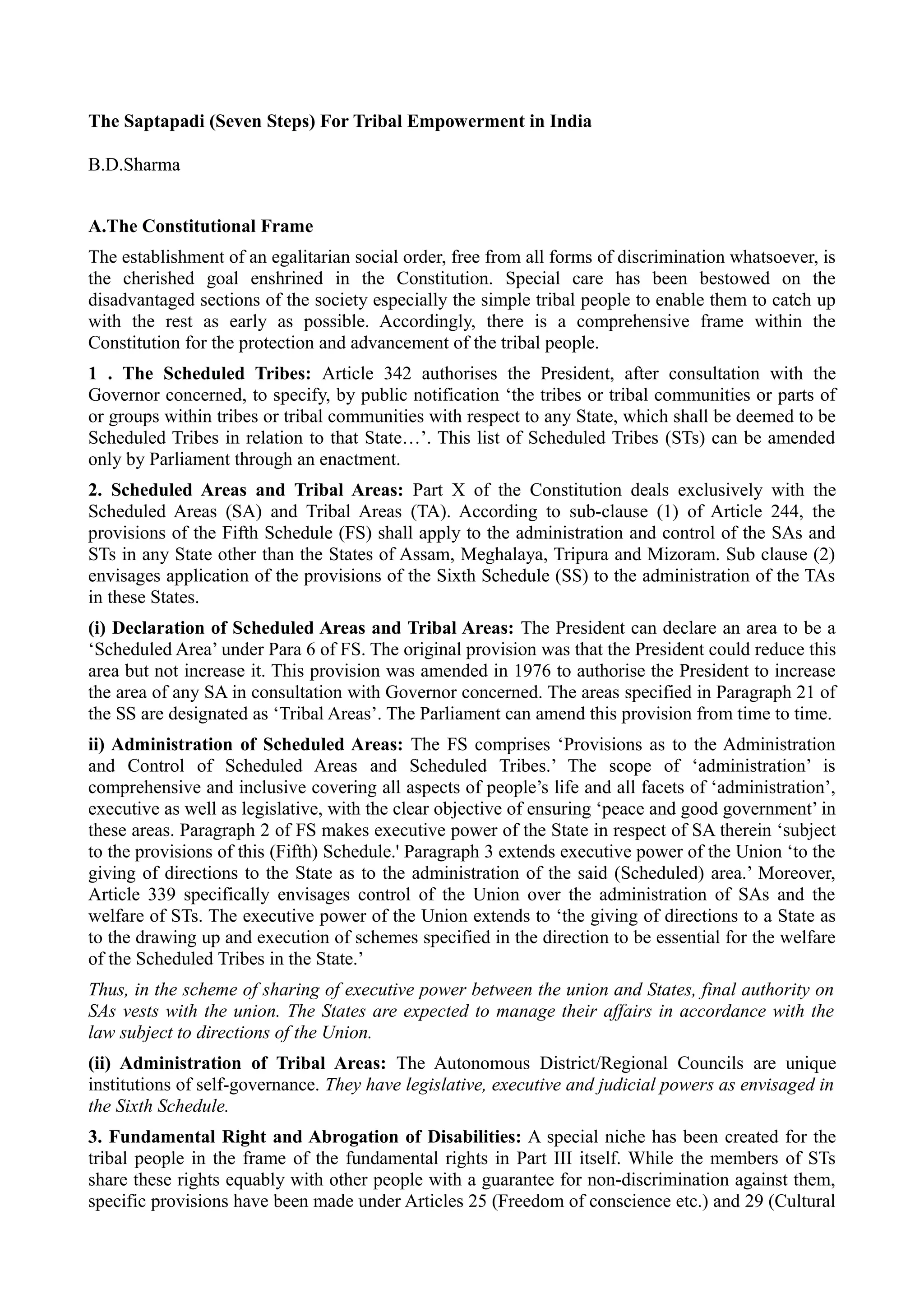 The document discusses the constitutional framework for tribal empowerment in India. Key points include: