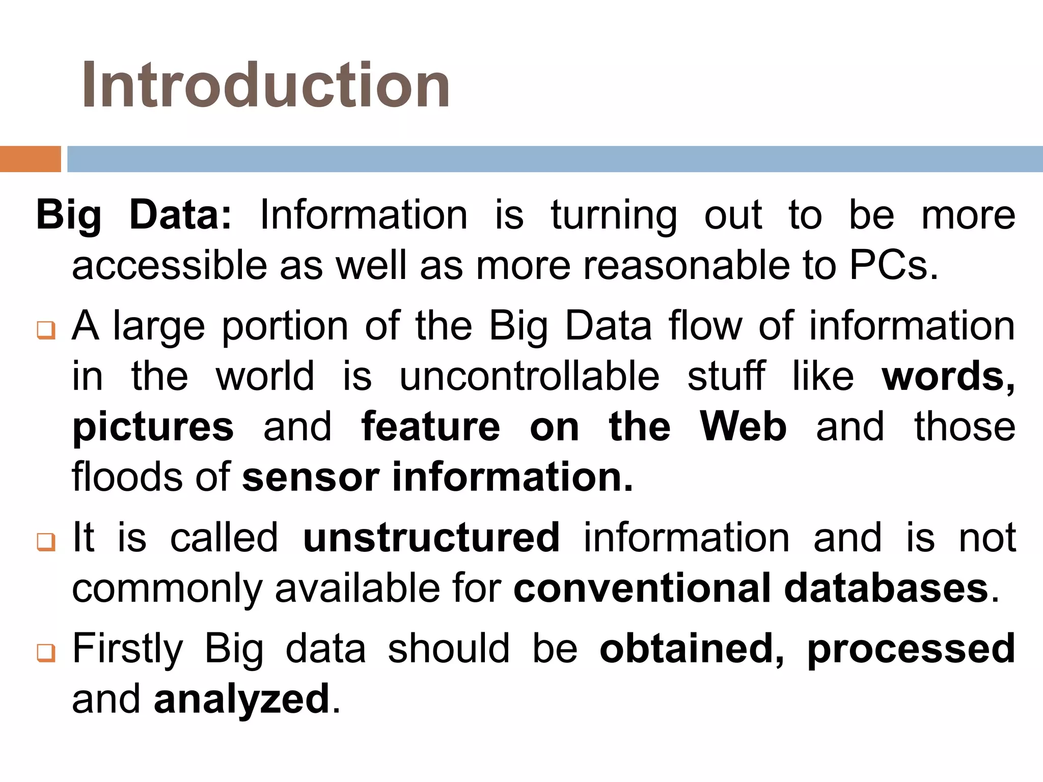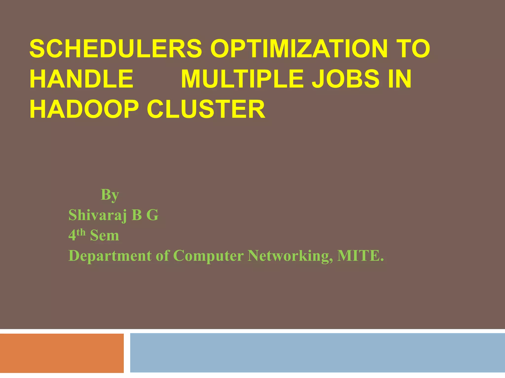 The document discusses optimization of job scheduling in Hadoop clusters, highlighting issues with the default FIFO scheduler and introducing alternative approaches such as the Fair Scheduler and Capacity Scheduler. It details the characteristics of big data, the functionality of Hadoop's HDFS and MapReduce, and presents methodologies for job scheduling to enhance performance. The findings indicate improvements in processing speed and efficiency through the proposed scheduling techniques when handling large datasets.