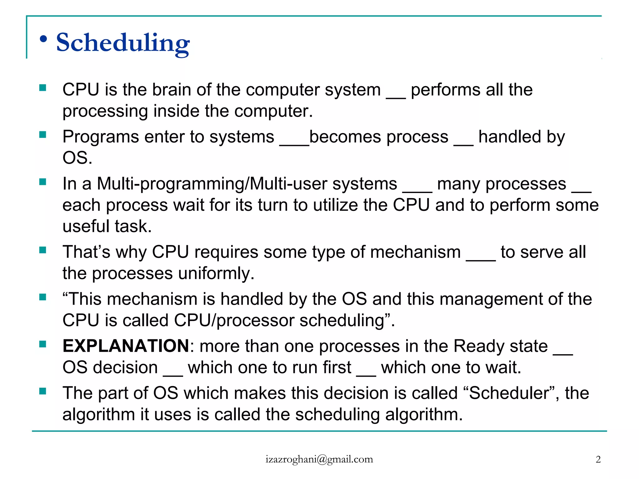 This document discusses various concepts related to CPU scheduling. It begins with definitions of scheduling and explains that the CPU requires a mechanism to allocate time to different processes in a fair manner. It then covers key scheduling concepts like scheduling levels (high, intermediate, low), types (preemptive vs non-preemptive), objectives, and algorithms like FCFS, SJF, priority scheduling, and round robin. The document provides examples and comparisons of different scheduling techniques.