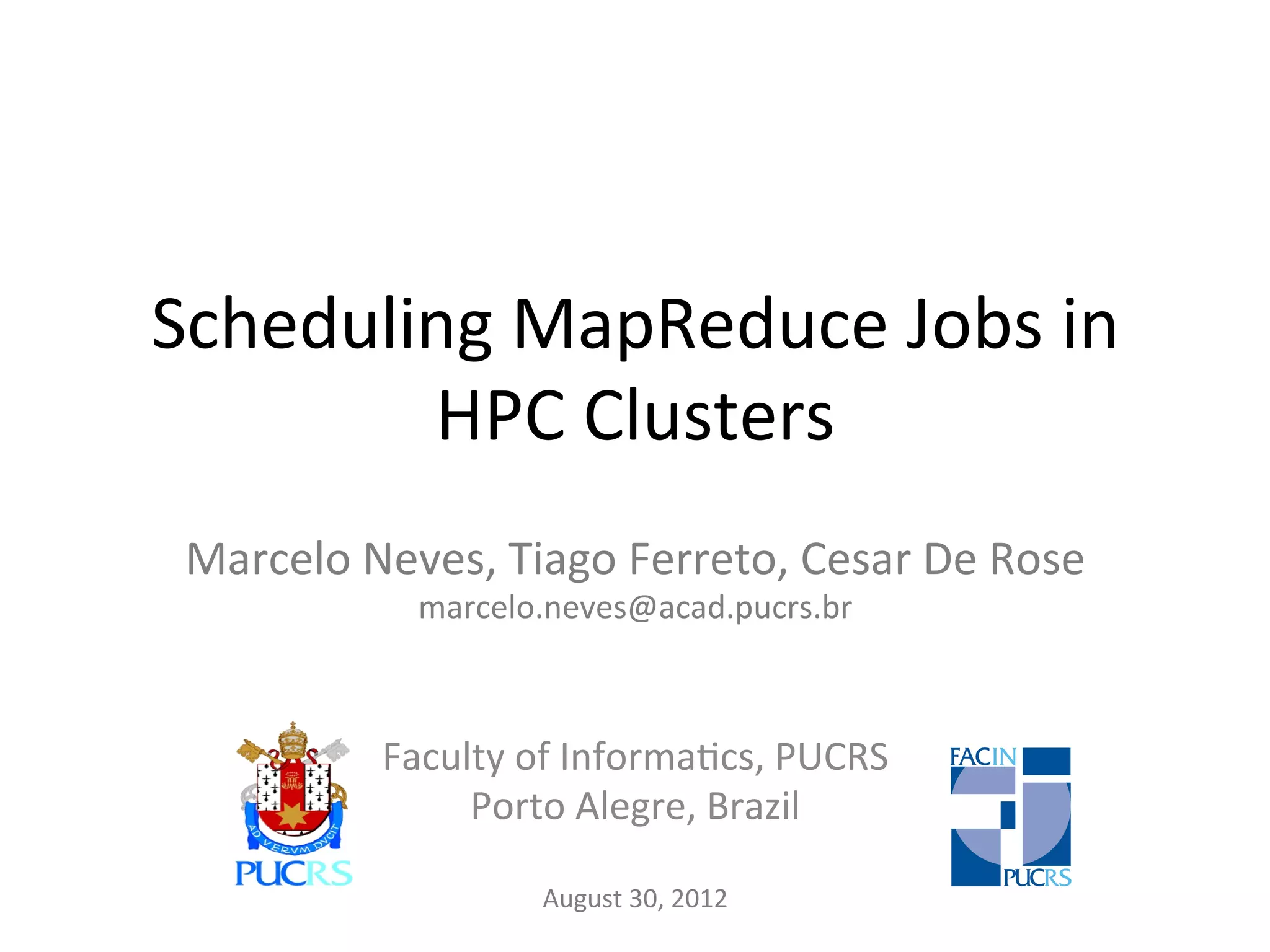 The document discusses scheduling MapReduce jobs in HPC clusters. It presents a MapReduce Job Adaptor that allows MapReduce jobs to run alongside regular HPC jobs in a shared HPC cluster managed by a resource management system. The adaptor estimates completion times for MapReduce jobs to minimize average turnaround times and better utilize unused cluster resources. An evaluation of the adaptor in a simulated cluster shows it reduces turnaround times for MapReduce-only and mixed workloads compared to a naive approach.
