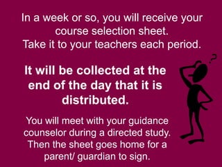The document provides information about the scheduling process at Shepherd Hill Regional High School. It explains that students will receive a course selection sheet to take to their teachers for recommendations and parent signature. Students select their electives and must meet any prerequisites. The course catalog on the school website provides course descriptions. Juniors have scheduling conferences in March, sophomores in April, and freshmen in April/May. It is mandatory to select alternative electives in case first choices are not available. Student requests are used to determine which classes will be offered and in how many sections. Schedule changes will not be made for classes not originally requested.