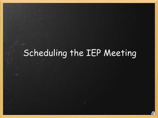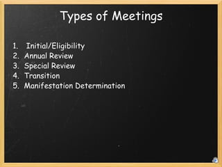 The document outlines the various types of IEP meetings including initial, annual reviews, special reviews, and transition meetings. It emphasizes the importance of documenting meeting types, attendance, and attempts to contact parents, while also listing required invitees such as educators and service providers. The document serves as a guide for organizing and conducting IEP meetings effectively.
