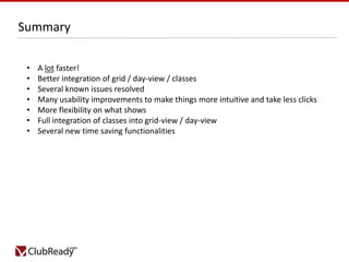 - The scheduling functionality update included improvements to integration between day/grid views and classes, ability to book classes from multiple views, better date selection and staff filtering in grid view, and more intuitive rescheduling and time blocking. Color coding and tooltips were also improved for easier understanding of booking statuses. Usability enhancements were made throughout to reduce clicks and make common tasks faster.