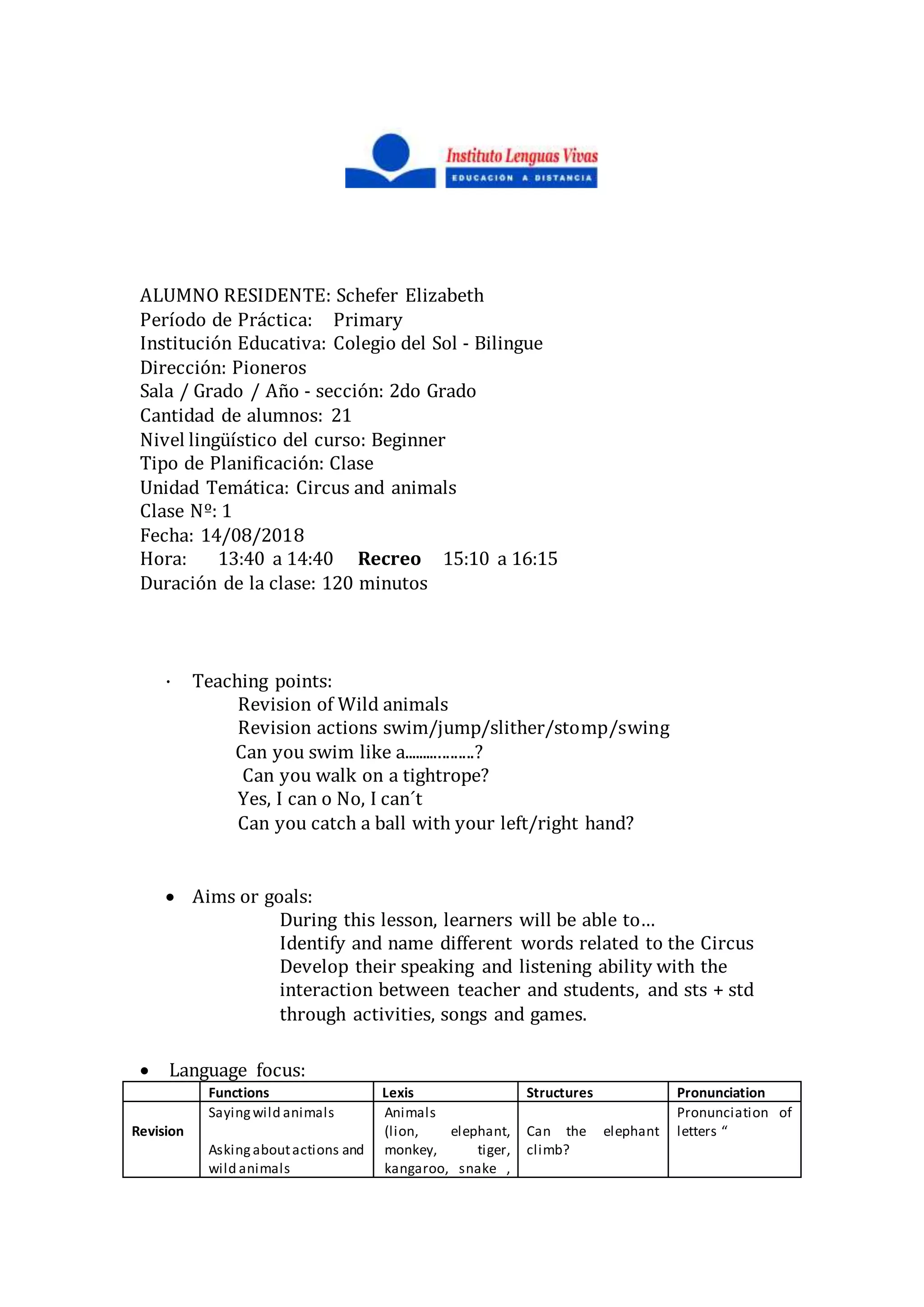 The document provides a lesson plan for a 2nd grade Spanish class focused on circus vocabulary and actions. The plan includes warm-up activities to review animals and actions, teaching circus vocabulary through pictures and questions, a worksheet for students to complete individually and with partners, and a closing mime activity. The plan aims to develop students' speaking, listening, writing and reading skills through interactive games, songs and partner work integrating multiple intelligences.
