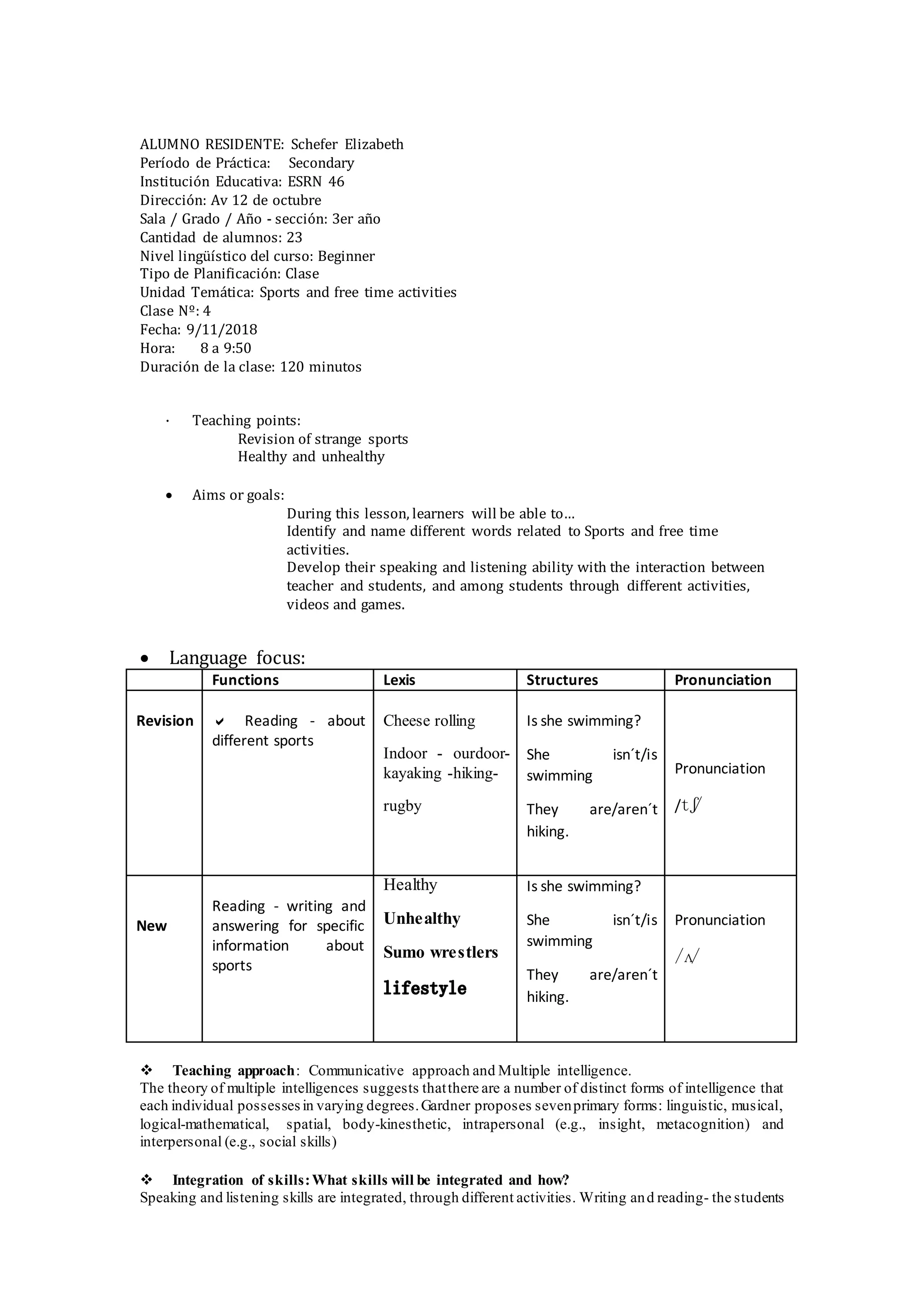This lesson plan is for a 3rd year beginner English class with 23 students. The lesson focuses on sports and free time activities. The objectives are for students to identify and name different words related to sports, and develop their speaking and listening skills through various interactive activities. The plan includes a warm-up activity revising sports vocabulary, reading and answering questions about sumo wrestling, playing a Jenga game using sports sentences, listening to and completing lyrics from Shakira's "Waka Waka" song, and making posters about sports they enjoy. A variety of teaching methods are used including group work, games, reading, writing and songs to engage students and integrate different skills in an communicative classroom environment.