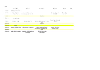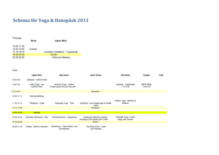 The document outlines a schedule for a yoga and dance retreat during Easter 2011, featuring various activities such as sadhana, hatha yoga, authentic movement, and lifedancing. It includes daily morning meetings, sharing sessions, meals, and meditation practices, spanning from Friday to Monday. The retreat emphasizes personal growth and healing through a diverse range of yoga styles and movement-based practices.