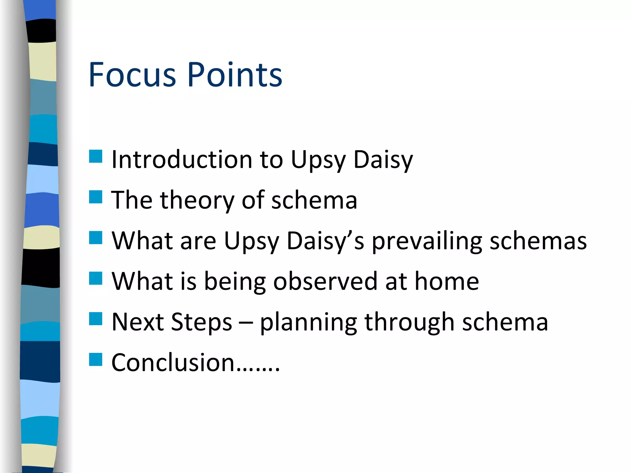 This document discusses the theory of schemas and how it applies to understanding the development and learning of a child named Upsy Daisy. It describes Piaget's theory of cognitive development in stages and defines schemas as patterns of behavior that develop through experience. The document outlines observations of Upsy Daisy's play that indicate schemas around containing and enveloping objects. It proposes next steps for planning activities to further develop Upsy Daisy's language and thinking through engaging with these schemas.