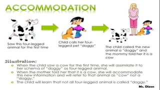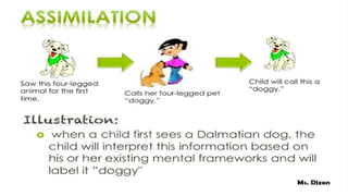Jean Piaget was a Swiss psychologist who pioneered the study of child development and introduced the concept of cognitive schemas. Schema theory describes how knowledge is acquired, processed, and organized through mental representations called schemas. Schemas allow people to understand new information based on prior knowledge and experiences. According to Piaget, cognitive development involves two processes: assimilation, where new information is incorporated into existing schemas, and accommodation, where schemas change to fit new information. Through assimilation and accommodation over time, schemas adapt and become better organized, allowing individuals to make sense of their environment.