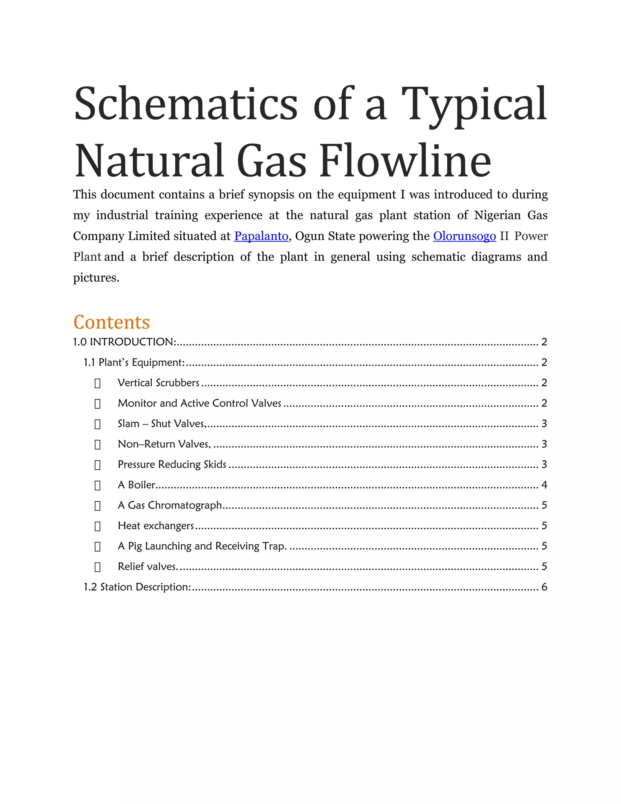 The document contains a description and schematics of a typical natural gas flowline and reduction and metering station. It describes the equipment used at the station, including vertical scrubbers to filter gas and remove liquids, active and monitor valves to control pressure, slam-shut and non-return valves for safety, pressure reducing skids to lower gas pressure for customers, a boiler, gas chromatograph, heat exchangers, and a pig launcher/receiver. It provides details on how the natural gas flows through the station's equipment to be conditioned, heated, pressure reduced, measured, and sent to end users.