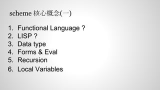 This document discusses core concepts in Scheme programming language, including functional programming, LISP, data types, forms and evaluation, recursion, and local variables. It provides examples of different data types in Scheme like booleans, numbers, characters, strings, symbols, and lists. It also explains evaluation of self-evaluating forms, symbols, function calls, and special forms. Examples of recursion and local variables using let and lambda are presented.