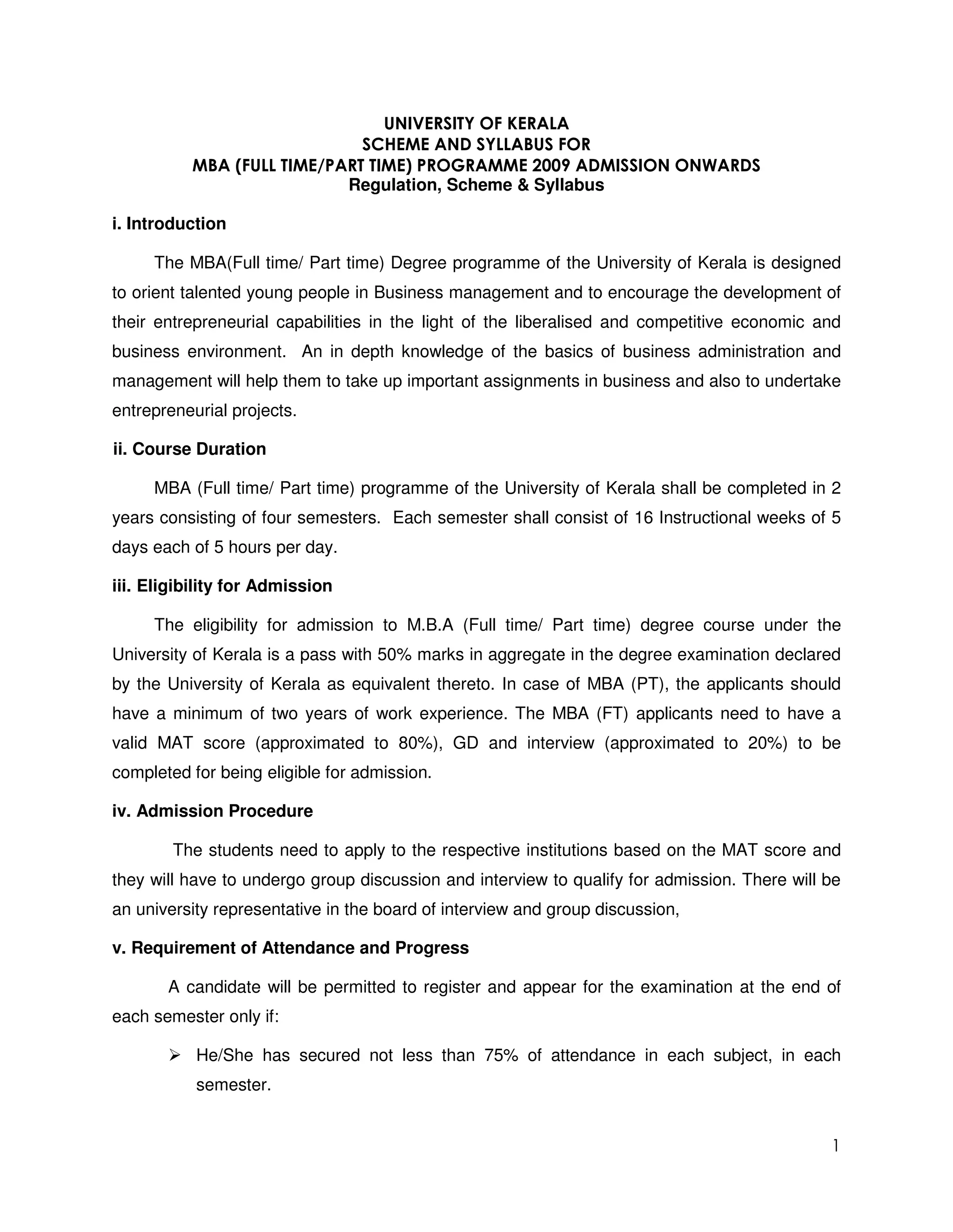 The document outlines the scheme and syllabus for the MBA (Full Time/Part Time) program at the University of Kerala from 2009 onwards.