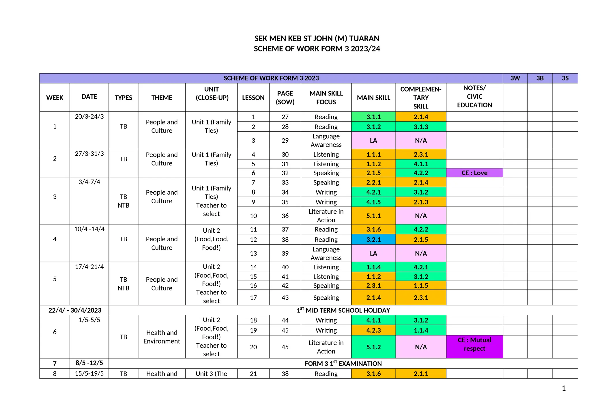 The document outlines a detailed scheme of work for Form 3 for the academic year 2023/24, including lesson plans, skill focuses, and complementary skills across various units. It incorporates topics related to people and culture, health and environment, science and technology, with a clear schedule of activities and examinations. Additionally, civic education themes such as love, mutual respect, and responsibility are integrated throughout the curriculum.