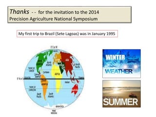This document provides an overview of the history and future of precision agriculture. It discusses early efforts using soil testing and yield monitors in the 1990s. Current technologies like crop canopy sensors that measure biomass and chlorophyll are highlighted. The document also reviews ongoing work optimizing in-season nitrogen management. International collaboration between USDA-ARS and Embrapa Brazil on precision agriculture research is summarized.
