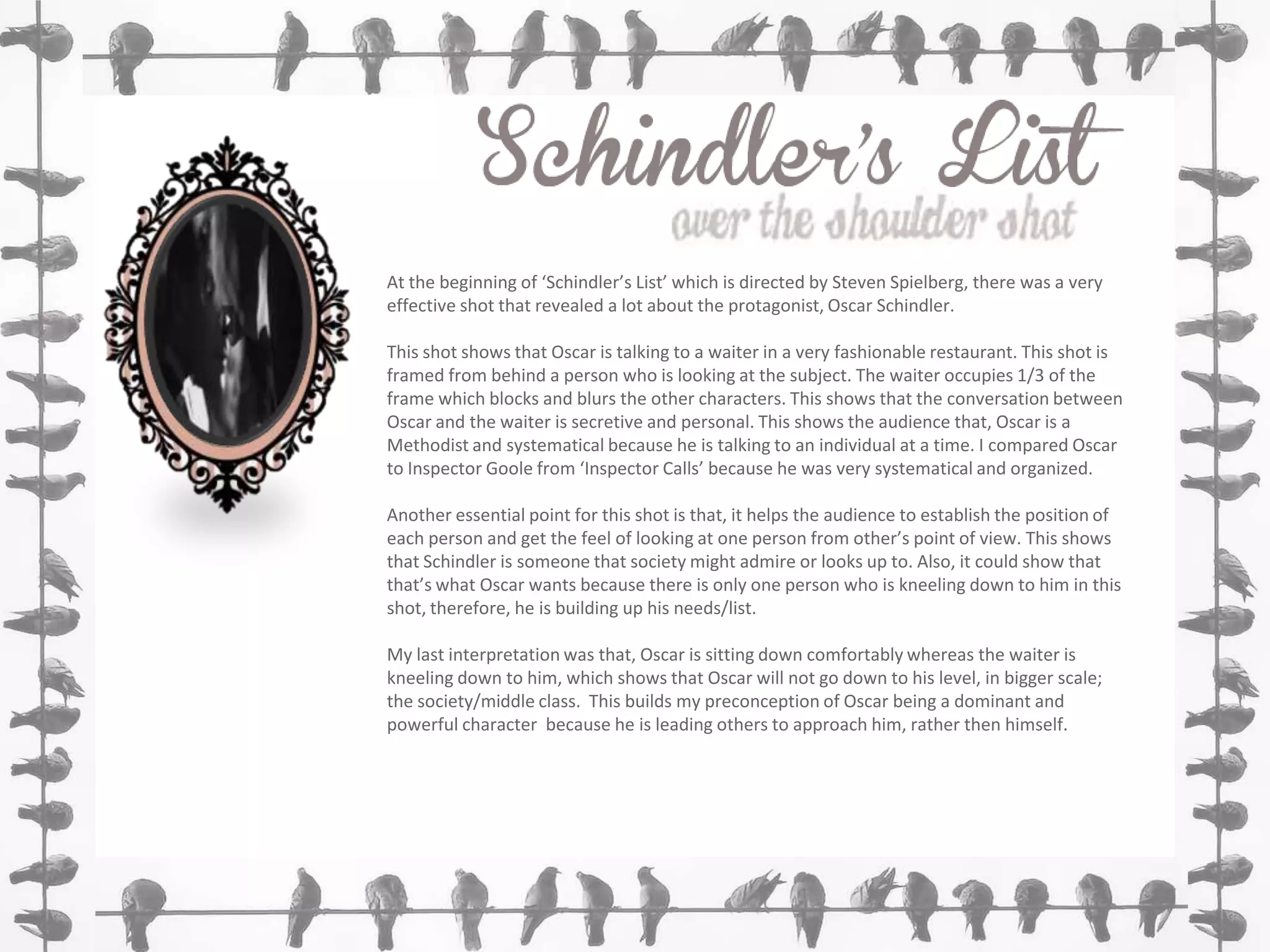 The document discusses and analyzes several shots from the film Schindler's List directed by Steven Spielberg. It summarizes the establishing shot at the beginning of the film where Oscar Schindler is shown talking privately to a waiter in a restaurant, establishing Schindler as powerful and methodical. It then analyzes another shot showing Schindler in his office which reveals differences in his and another character's organization and roles. Finally, it discusses a long shot showing Jews in a field as isolated and vulnerable, foreshadowing their potential extinction.