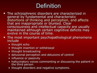 The document provides information about schizophrenia, including its definition, symptoms, diagnosis, course, treatment, and etiology. Some key points: