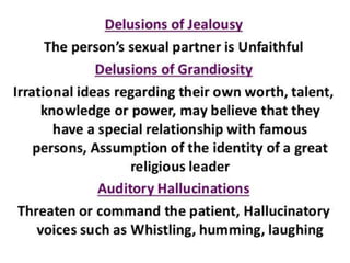 2) Schizophrenia is classified by symptoms in the DSM-IV and ICD-10 and includes delusions, hallucinations, disorganized speech/behavior, and negative symptoms.