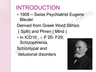 Schizophrenia is a complex psychotic disorder characterized by disturbances in thinking, emotions, and behavior, often leading to social withdrawal and various symptoms such as hallucinations and delusions. It has several subtypes classified in the ICD-10 system, with varying prognoses and treatment responses, and its etiology involves a combination of genetic, chemical, and environmental factors. Diagnosis relies on clinical observation and history, with treatment focusing on reducing symptoms through pharmacotherapy and psychosocial interventions.