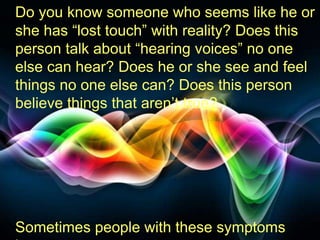 The document discusses schizophrenia, including its symptoms, types, causes, and treatment options. It defines schizophrenia as a chronic, severe mental illness characterized by symptoms of thought, behavior, and social problems where a person's thinking is out of touch with reality. The main types and symptoms are described. Treatment involves antipsychotic medications to reduce symptoms, as well as other approaches like family support, social skills training, supported employment, and cognitive behavioral therapy. Side effects of medications are also discussed.