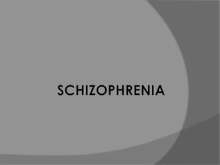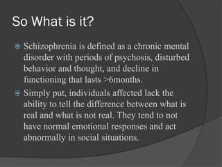 Schizophrenia is a chronic mental disorder defined by periods of psychosis and disturbed thoughts and behavior lasting over 6 months. It involves an inability to distinguish between reality and delusions. Diagnosis requires 2 or more symptoms such as hallucinations, disorganized behavior, or negative symptoms. Schizophrenia has no single cause but is thought to involve genetic and environmental factors. It affects over 2 million Americans and has enormous societal costs due to disability and healthcare expenses. Treatment involves antipsychotic medication to control symptoms, though medication may have dangerous side effects.
