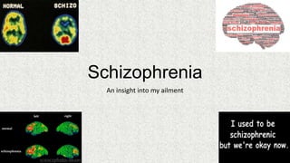 This document is a fictional account of schizophrenia written for a high school psychology class. It provides information about the symptoms and experiences of living with schizophrenia, including hearing voices, difficulty trusting others and functioning socially. It discusses the history and causes of schizophrenia, how it typically develops in late adolescence/early adulthood, and treatments like medications that can help manage symptoms in many cases. The document aims to provide insight into what it's like to live with schizophrenia from the perspective of someone experiencing it.