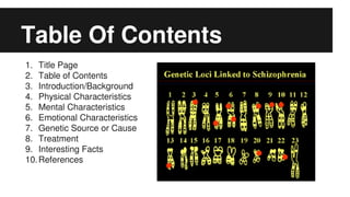 Schizophrenia is a mental disorder first identified in 1887 that causes hallucinations, delusions and disorganized thinking. It has strong genetic influences, with a 10% chance of developing it if a close relative has it. Physical signs include a blank facial expression while mental signs include hallucinations, delusions and disorganized speech. Emotionally, those with schizophrenia have reduced ability to feel pleasure and may feel detached. Treatment involves newer antipsychotic medications that can help control positive symptoms.